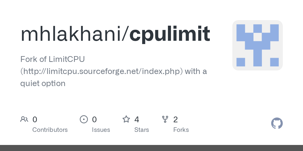 [root@tmp]# cpulimit --help Usage: cpulimit [OPTIONS...] TARGET OPTIONS -l, --limit=N percentage of cpu allowed from 0 to 200 (required) -v, --verbose show control statistics -z, --lazy exit if there is no target process, or if it dies -i, --include-children limit also the children processes -h, --help display this help and exit TARGET must be exactly one of these: -p, --pid=N pid of the process (implies -z) -e, --exe=FILE name of the executable program file or path name COMMAND [ARGS] run this command and limit it (implies -z) Report bugs to <[email protected]>.