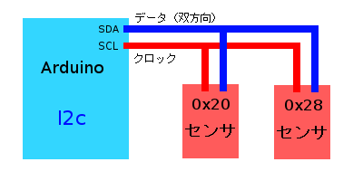 I2Cとの違いはまだあり、データ通信に使う線が2本あります