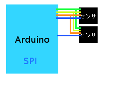 SPIで接続すればデータ受信、データ送信、クロックは共有して使い、センサを選択する線を1つづつになり、5ポートになります。また、1つセンサを追加するごとに1ポートだけ消費するだけになります(元の状態では3ポート)