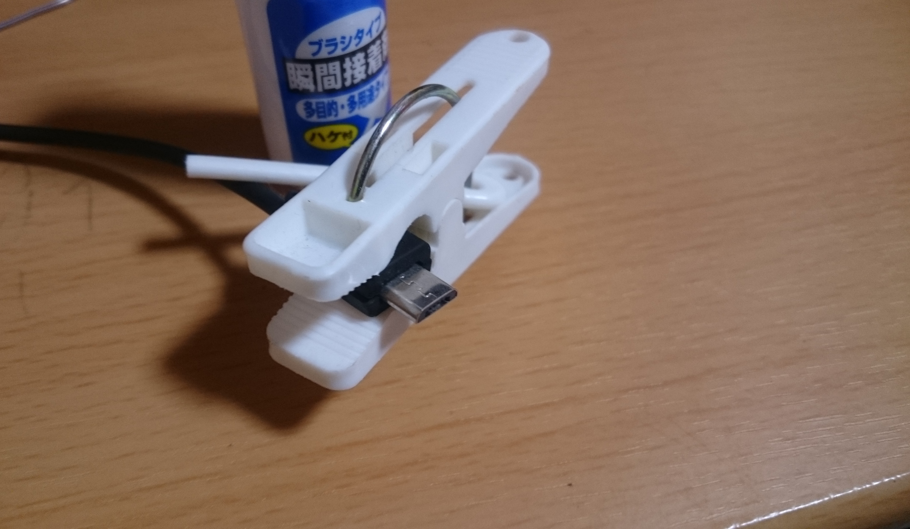 ACアダプタの金具を使ってみたところ、上のパーツがmicroUSBの形状と合わないのでこの状態のまま使います