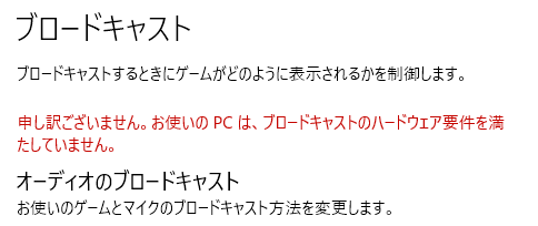 ゲームのキャプチャやブロードキャストは一定以上のCPUやグラフィックボードがないと使えないようになっています