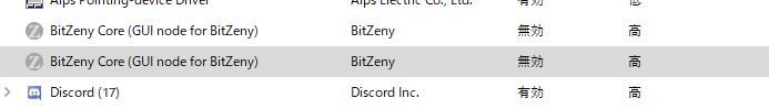 タスクマネージャーのスタートアップから残っているBitZeny Coreをすべて無効化します
