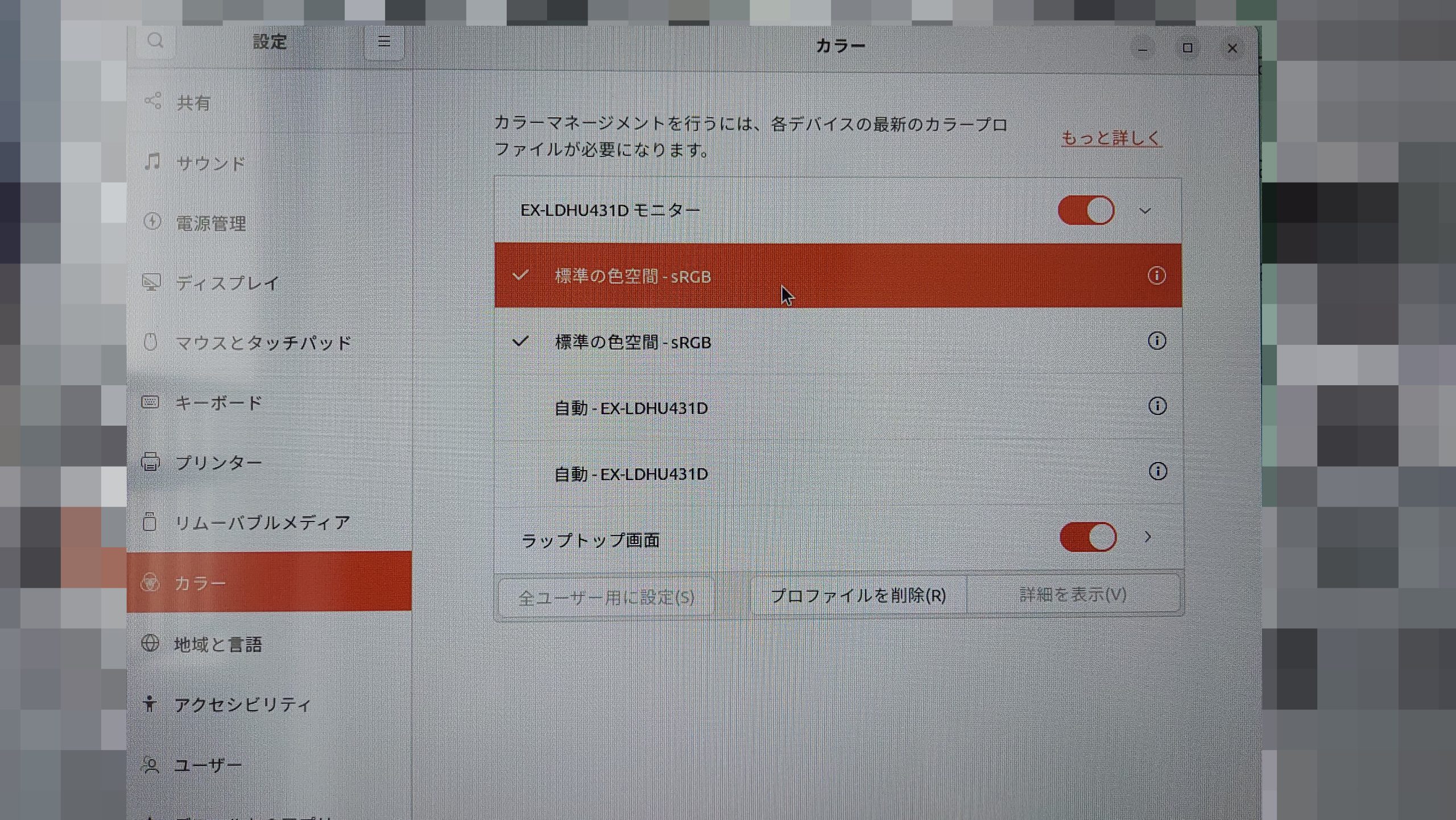あと初期段階のUbuntu機で繋いだところカラープロファイルが正しく認識されていませんでした