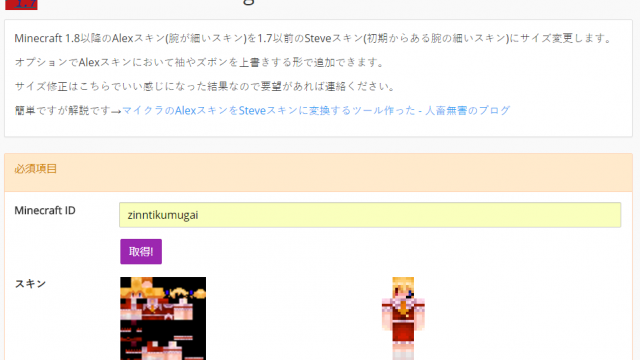 MinecraftマイクラのAlexスキンをSteveスキンに変換するツール作った だいぶ前から思っていることがあり、Alexスキンを利用して1.7.10などをプレイしてあるのが腕の仕様で一部が抜けて(黒くなっている)しまっているため、第三者視点に切り替えたとき残念な絵面が出てしまう点です普通にプレイする分には影響は殆どあ... 2017.06.25Minecraft